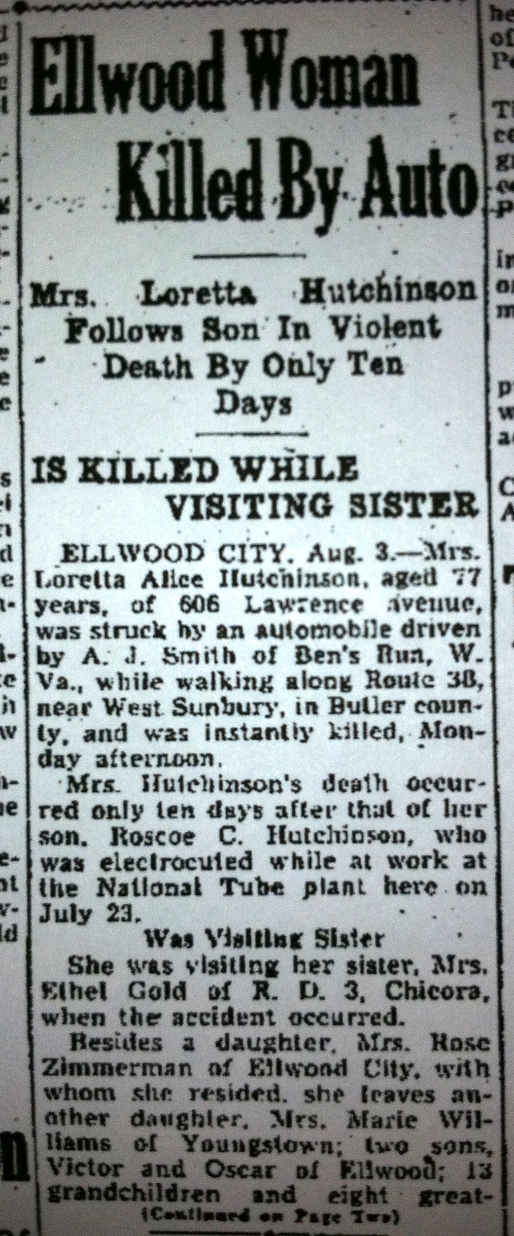 On 23 July 1948, Roscoe Campbell Hutchinson was electrocuted while on the job at the National Tube company. He was 51 years old, leaving a wife, four children, two brothers, two sisters, and his mother Loretta Hutchinson.