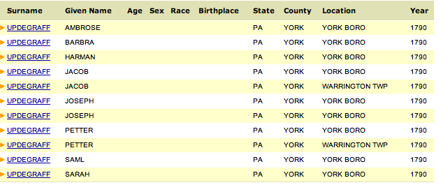 Results: There were 11 households with the name Updegraff in Pennsylvania in 1790, all in York County (There are probably more if you take into account spelling variations- you can use Ancestry.com to cross reference).