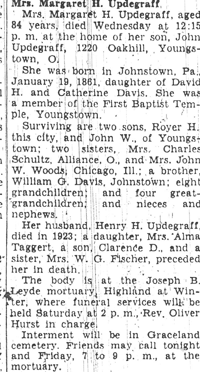 Margaret Davis married Henry Herman Updegraff in 1881. Her siblings considered her “marrying well.” The young couple moved to New Castle between 1885 and 18892 (just before the horrendous Johnstown Flood of 1889). Margaret and Henry raised four children: Clarence David, Royer Howard, John William, and Alma Catherine. Margaret’s younger sister, Rachel Davis also lived with Margaret and Henry until she was married to William G. Fischer in 1901.