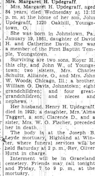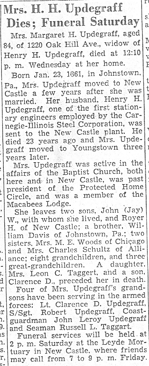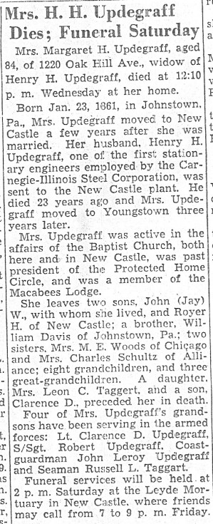 1 The obituaries posted in the Youngstown Vindicator and New Castle News have conflicting birth dates: 23 January 1861 and 19 January 1861, respectively. Margaret’s death certificate lists the birth date as 19 January 1861.