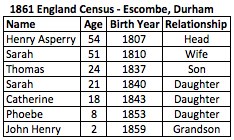 Phoebe Asperry, Daughter, Unmarried, 8, Scholar, born Escomb, County Durham
