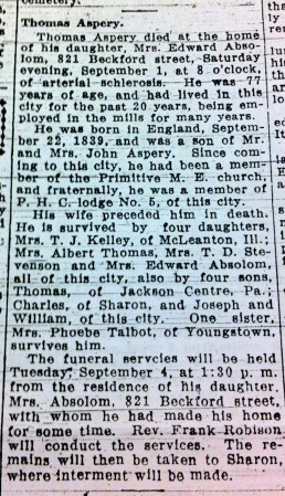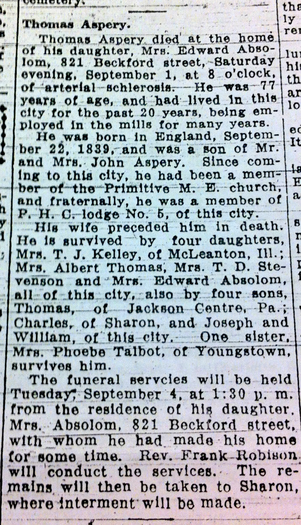 First, I ordered a couple obituaries for Thomas.  This one lists a father named John Aspery and a sister, Phoebe Talbot of Youngstown.