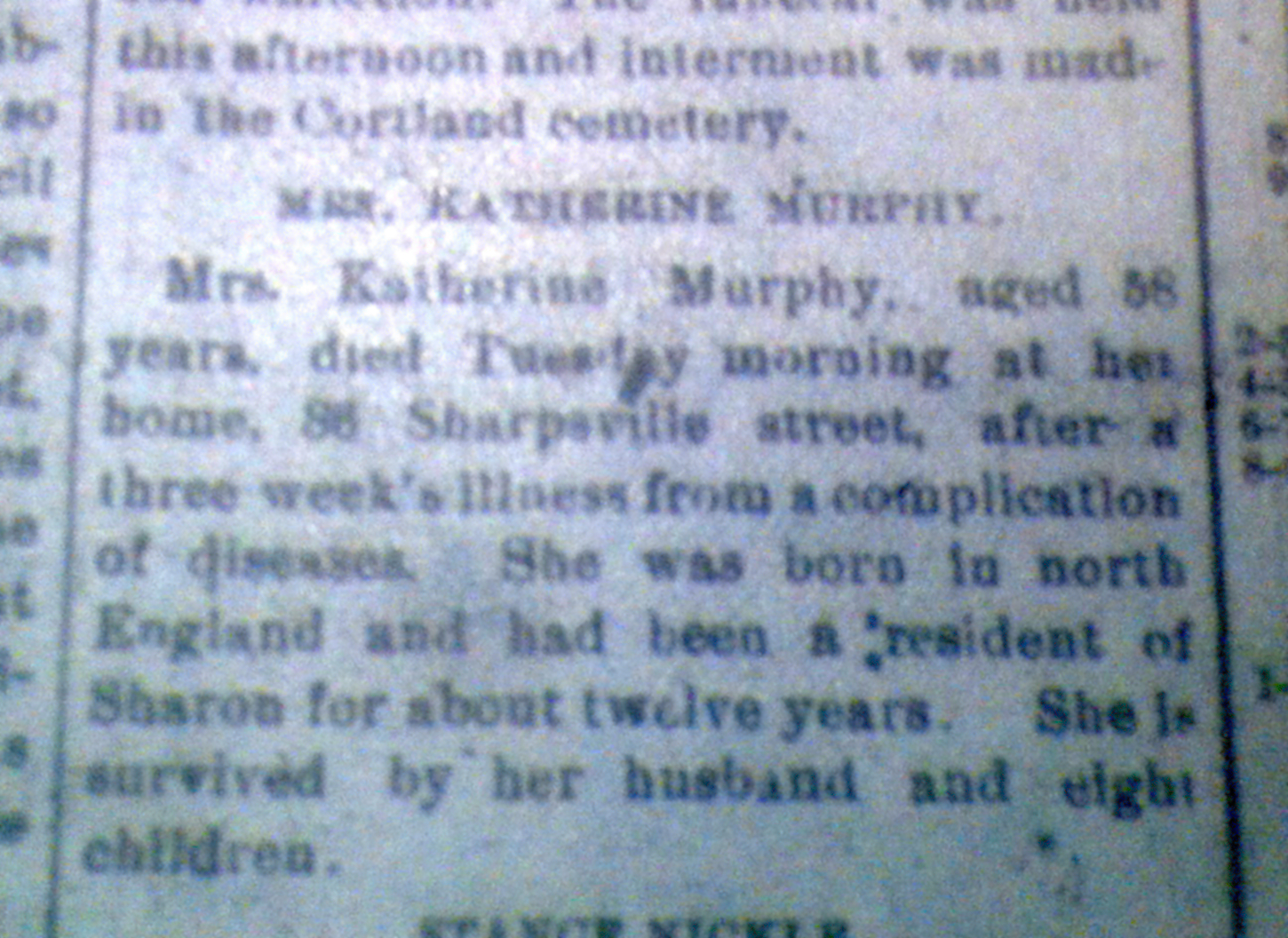 Catherine passed away on 21 January 1902 from “liver troubles,” having been ill for three weeks. She was buried at St. Mary’s Cemetery, a Catholic cemetery managed by the Sacred Heart Church. She left her husband and eight children.