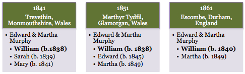Surprisingly, Edward and Martha Murphy with child William were easy to find. They stuck out at me because they also had two daughters: Sarah and Mary. William had twin daughters named Sarah and Mary. Maybe he named them after his sisters? With more investigation, it became clear that this was “my” William Murphy family.
