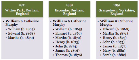 William’s father, Edward Murphy, Sr., now a widow, was living in the household in 1881 . William’s sister, Martha was also living with them and her daughter, Mary Quinn.